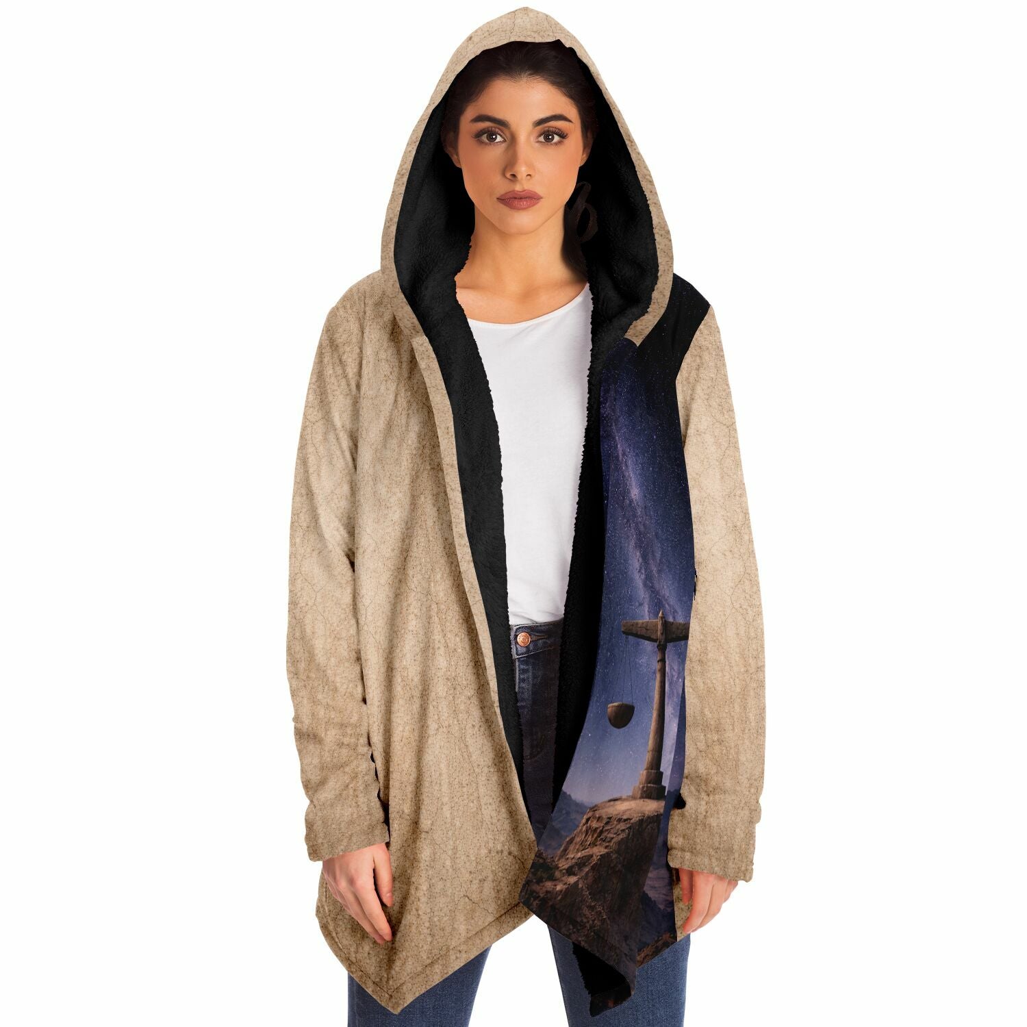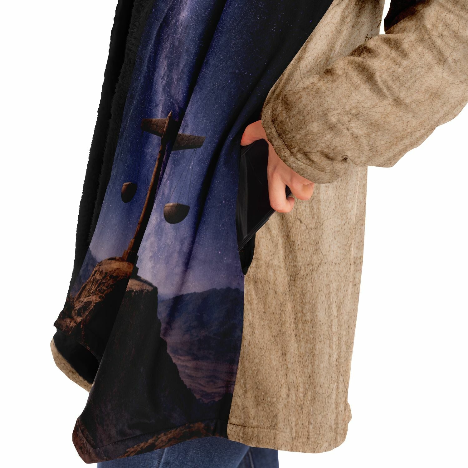This luxurious cloak is made from an ultra-soft premium microfiber fleece lining. The outside is made with a micro-mink polyester fabric that allows the print to be high definition with vibrant colors. Featuring two deep side pockets to keep your belongings safe and your hands warm.